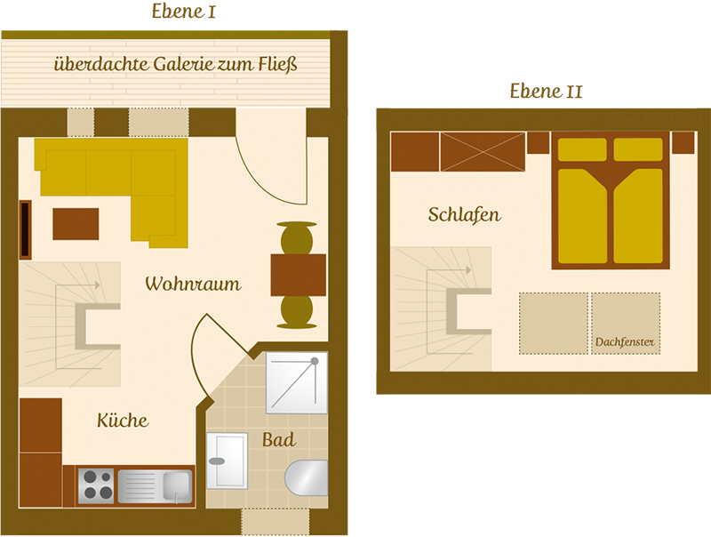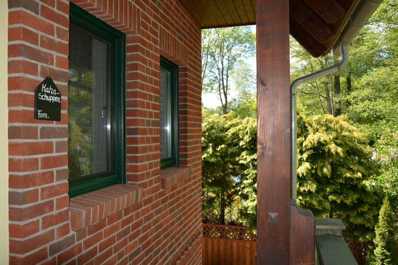 Auch die Wohnung Kahnschuppen befindet sich auf der Galerieebene mit Blick auf´s Wasser. Eine kleine Sitzgelegenheit bietet ihnen die Möglichkeit den ersten Kaffee am frühen Morgen mit den ersten Sonnenstrahlen und den Rehen am anderen Ufer zu teilen.
